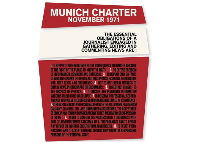 موازین حرفهاخلاقی سندهای گوناگونی است که از سوی رسانهها برای کارکنان خود یا نهادهای جهانی دفاع از حقوق روزنامهنگاران برای همهی روزنامهنگاران گردآوری شدهاند ونگرنده بر حقوق و وظایف خبرنگاران هستند. از منشور حرفهاخلاقی خبرگزاری فرانسه یا بی بی سی و نیویورک تایمز تا یونسکو و منشور جهانی و معتبر مونیخ، این موازین با تفاوتهایی اما در سازگاری با موازین حقوق جهانی و میثاقهای حقوق بشر هستند.